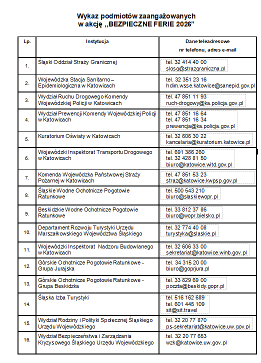 Wykaz podmiotów zaangażowanych w akcję ,,BEZPIECZNE FERIE 2026”