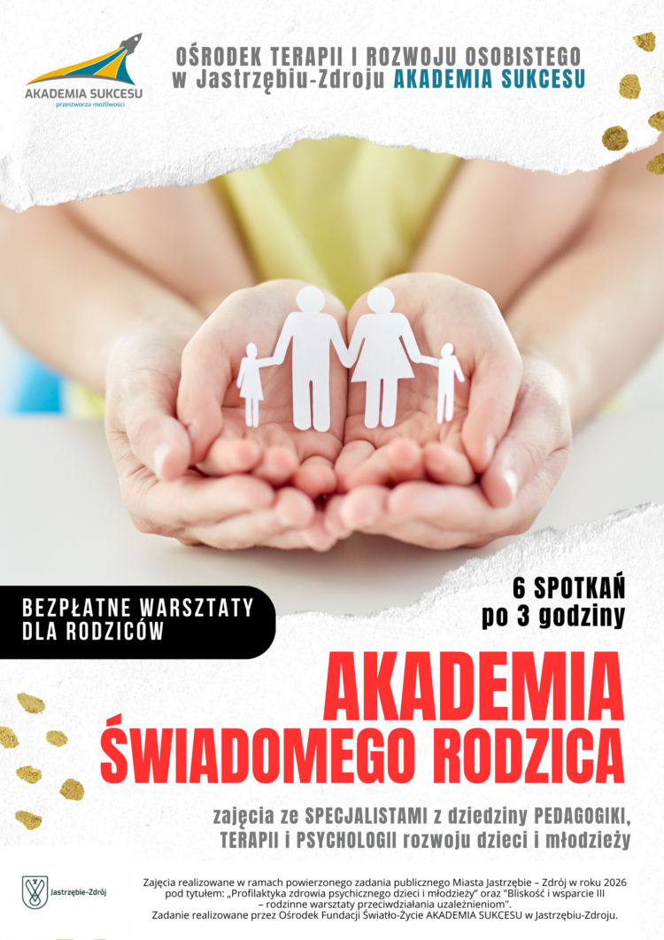 Akademia Sukcesu zaprasza rodziców do udziału w programie „Akademia Świadomego Rodzica”. Jest to cykl 6 spotkań, podczas których poruszane będą najważniejsze tematy związane ze wspieraniem zdrowia psychicznego dzieci i młodzieży. Spotkania prowadzone będą przez specjalistów: psychologów, terapeutów i pedagogów. Zajęcia mają charakter warsztatowo-edukacyjny – łączą omówienie zagadnień z ćwiczeniami oraz przykładami rozwiązań możliwych do zastosowania w domu. Odbywają…Continue reading Akademia Świadomego Rodzica
